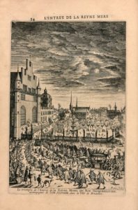 [MARIE de MÉDICIS]. La SERRE (Jean Puget de). Histoire cvrievse de tovt ce qvi s’est passé a l’entree de la Reyne Mere dv Roy Treschrestien dans les villes des Pays Bas. A Anvers, En l’Imprimerie Plantinienne de Balthasar Moretus, 1632. Petit in-folio (202 x 296 mm), maroquin brun, plats entièrement ornés d’un décor de volutes et guirlandes dorés et à la cire, à sept petites fleurs de lys, dos à nerfs orné du même motif, tranches dorées (reliure pastiche de Hagué).