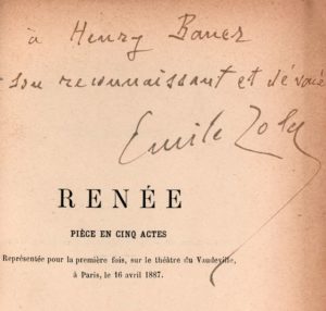 le Théâtre du Vaudeville, à Paris, le 16 avril 1887. ENVOI d’Émile ZOLA sur le faux-titre : « à Henry Bauer // son reconnaissant