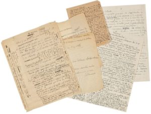 Correspondance à l’éditeur de ses Paysages légendaires (1929). Outre la préparation du recueil, Rouault parle de sa participation comme graveur et écrivain à la revue Les Funambules (dirigée par son ami André Girard et éditée par Porteret, cette revue ne connut qu’un numéro, paru le 1er décembre 1926, pour lequel Rouault donna trois textes et deux gravures). Il évoque également ses démêlés financiers avec plusieurs bailleurs de fonds dont Étienne de Jouvencel. « Dites à G[irard] franchement une fois pour toutes. Il écrit quatre pages où il proteste de son amitié pour moi. Je devrais être très touché et je ne le suis point tout à fait, ceci dit sans vouloir lui faire aucune peine. [...] Le moindre geste, je ne dis pas d’humilité, c’est trop, mais de simplicité cordiale et enfantine d’un cœur fidèle me touche plus que tous les discours, fussent-ils même très éloquents. Je ne crois plus aux paroles. Je suis l’intérêt instinctif et primordial de l’individu. Je suis un vieux Chinois – de la vieille Chine né à Paris-Île-de-FranceBelleville : alliage singulier. Un vieux singe à qui on n’apprend pas à faire la grimace qui est né en la faisant. Le danger avec moi [...] c’est de croire que je puisse m’arranger d’une salade russe quelconque, je ne puis prendre vessies pour lanternes, la lumière pour les ténèbres, le cœur pour un viscère quelconque, l’esprit pour une lourde pierre, la grimace aimable des jeunes babouins nés malins pour le sourire de Reims »... 4 décembre 1926. Instructions pour corriger la liste des poèmes… 3 mars 1929. « Je viens de faire un essai concluant. Donnez-moi des blancs un peu plus généreux – pas énormément – soit en augmentant le format du livre et en gardant le papier s’il est commandé pour le prochain ouvrage, soit en recomposant, ce que je voudrais vous éviter [...] mais le but et l’enjeu en valent la peine, c’est pour de nouveau vous proposer les 45 culs-de lampe. Qu’aucun blanc n’ait moins de 7 ou 8 centimètres et je vous donne votre affaire. Ce qu’il faut c’est que mon dessin n’arrive plus dans les lettres – qu’il en soit séparé par un blanc »… « Ces ouvrages Paysages légendaires plus Faubourg m’ont fait reculer beaucoup d’autres choses qu’il me fallait donner avant mon départ de Paris [...] de là avec les chaleurs un effort tout à fait contraire à une bonne hygiène du foie »... « Je tiens à composer chaque page. Je n’ai jamais accepté qu’une question de date puisse risquer de me déshonorer artistiquement parlant »…. « Il n’a jamais été convenu que je ferai des culs-de-lampe sur le contrat ou des modèles – mais maintenant que j’ai remis en fonction d’architecture – une page c’est comme une maison, ni plus, ni moins, (cela a l’air prétentieux mais pour moi je sais ce que je veux dire) alors vous voudrez bien me laisser chambarder même l’écriture – même si vos imprimeurs rouspètent, cela n’a aucune importance, – et l’équilibrer »... Etc. On joint 3 lettres dictées par Rouault à sa fille Isabelle.