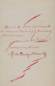 BARBEY D'AUREVILLY Jules (1808-1889). L.A.S. « Jules Barbey d’Aurevilly », [1860, à son éditeur Achille BOURDILLIAT] ; 2 pages in-8 à l’encre rouge (petite fente réparée).