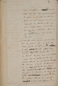 Manuscrit complet de ce texte romanesque et en partie autobiographique, où s’affirme déjà, à vingt ans, le grand écrivain. La rédaction de Novembre, de 1840 à octobre 1842, a été entreprise après la rédaction des Mémoires d’un fou, dont il est le prolongement dans la transposition romanesque de l’autobiographie. Après l’aventure amoureuse des quinze ans, Flaubert met en scène l’éveil de la sexualité chez l’adolescent de dix-huit ans, tout juste sorti du collège, dont les souvenirs occupent les premières pages. « Le sujet est la perte du pucelage d’un jeune homme avec une putain idéale. Il y a dans le jeune homme beaucoup de Flaubert, désespérances, aspirations, mélancolie, misanthropie, haine des masses », écrivent les Goncourt dans leur Journal alors que Flaubert leur a lu « son premier roman » (1er novembre 1863). Pendant la rédaction de Novembre, Flaubert en parle à son ancien professeur Gourgaud-Dugazon comme d’une « ratatouille sentimentale et amoureuse […] L’action y est nulle. Je ne saurais vous en donner une analyse, puisque ce ne sont qu’analyses et dissections psychologiques » (janvier 1842). Malgré les dérisions de Flaubert, on ne peut qu’approuver le jugement de Maurice Bardèche : « Novembre est assurément la plus élaborée des œuvres de jeunesse de Flaubert ». Le narrateur commence par évoquer, par une soirée d’automne qui donne son titre au récit, ses souvenirs de collège, les illusions et les aspirations de sa jeunesse jusqu’au dessèchement le plus complet de son cœur, dans la tonalité froide de la fin d’automne. « J’aime l’automne, cette triste saison va bien aux souvenirs. Quand les arbres n’ont plus de feuilles, quand le ciel conserve encore au crépuscule la teinte rousse qui dore l’herbe fanée, il est doux de regarder s’éteindre tout ce qui naguère brûlait encore en vous. » La trajectoire de son âme suit cette courbe descendante : « Autant j’avais eu d’exaltations et de rayonnements, autant je me renfermai et roulai sur moi-même. Depuis longtemps déjà j’ai séché mon cœur, rien de nouveau n’y entre plus, il est vide comme les tombeaux où les morts sont pourris. » Puis le narrateur raconte longuement sa découverte de l’amour et de la sexualité à travers la rencontre avec Marie, personnage paradoxal de prostituée qui lui fait connaître non seulement la chair mais l’amour sous sa plus haute forme, avant de disparaître brusquement. Flaubert s’inspire ici de sa liaison d’une nuit avec Eulalie Foucaud, la tenancière de l’hôtel Richelieu à Marseille en 1840, mais aussi de ses visites au bordel. Marie tient aussi de Mme Schlesinger, amour platonique du jeune Flaubert à Trouville. Après la confession et la disparition de Marie (« je ne l’ai plus revue », comme Flaubert n’a plus revu Eulalie), le narrateur se laisse entraîner dans une rêverie et des visions exotiques pour tenter d’échapper à la perte de l’aimée et à son ennui. Une brusque rupture introduit alors un nouveau narrateur qui commente avec sévérité et ironie le manuscrit qu’on vient de lire, et conte la triste fin du premier narrateur : « C’était un homme qui donnait dans le faux, dans l’amphigourique et faisait grand abus d’épithètes. […] Enfin, au mois de décembre dernier, il mourut, mais lentement, petit à petit, par la seule force de la pensée, sans qu’aucun organe fût malade, comme on meurt de tristesse, ce qui paraîtra difficile aux gens qui ont beaucoup souffert, mais ce qu’il faut bien tolérer dans un roman, par amour du merveilleux ». Après l’autobiographie complaisante, vient le regard critique et la déconstruction, qui annonce le romancier à venir. La page de titre Novembre porte le sous-titre : « fragments de style quelconque », et la date 1842, et l’épigraphe : « pour… niaiser et fantastiquer » (Montaigne). La dernière page porte la date : « 25 octobre 1842 ». Le manuscrit est rédigé à l’encre noire sur 96 feuillets de papier vélin écrits recto et verso et chiffrés 1-96. Les ff. 34-43 portent une ancienne numérotation 1-10. Le manuscrit est entièrement et très abondamment raturé et corrigé et comporte 2083 mots ou passages biffés corrigés ou ajoutés. Outre des ratures faites manifestement au fil de l’écriture, d’autres relèvent d’une révision lors d’une relecture. Le premier feuillet semble avoir été refait. Des paragraphes entiers sont biffés et cernés d’un trait de plume pour bien marquer leur suppression (nous renvoyons au tome I des Œuvres complètes de la Bibliothèque de la Pléiade, consacré aux Œuvres de jeunesse). Ainsi (f. 3, après l
