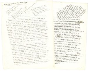 Première version inédite de la Lettre aux Français appelant les Français à s’unir pour sauver la France. [Saint-Exupéry, exilé aux États-Unis, se trouve dans une situation délicate : il ne veut pas choisir entre Vichy et De Gaulle, tout en voulant combattre le nazisme et l’Allemagne d’Hitler. Choisir De Gaulle est difficile pour lui, alors que le général n’est pas reconnu par le gouvernement américain. Après l’occupation de la « zone libre » le 11 novembre 1942, voulant alors rassembler les Français vivant aux U.S.A. et convaincre l’Amérique d’intervenir dans la guerre, il rédige un appel aux Français pour une allocution radiodiffusée le 29 novembre 1942 sur les postes américains émettant en langue française et largement reproduite dans la presse, recueillie dans Un sens à la vie, maintenant éditée sous le titre Lettre aux Français (Pléiade, t. II, p. 69-73).]