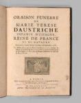 Oraison funèbre de Marie-Thérèse d’Autriche, Infante d’Espagne, Reine de France et de Navarre. Prononcée à Saint-Denis le premier de Septembre 1683. P., Sébastien Mabre-Cramoisy, 1683. In-4, maroq. noir, fil. et larmes argentées sur le dos et les plats, tr. marbr. (Rel. de l’époque).