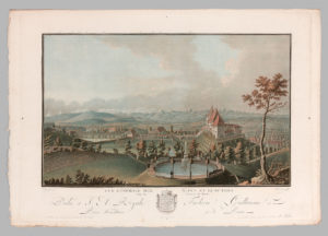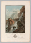 Vues remarquables des montagnes de la Suisse, dessinées et peintes d’après nature, avec leur description (par Albert de Haller et Wyttenbach, publiées par R. Hentzy). Amsterdam J. Yntema (se vend à Paris, chez Graff et chez Descourtis), 1785. In-fol., en ff., dans le carton de l’époque. Titre, 4 ff. d’introduction, 4 ff. de préface, 14 ff. pour l’explication du front. et des pl. avec une vignette en-tête par Dunker, un frontispice par Dunker gravé en bistre par Monnet et 42 superbes planches gravées par Descourtis, Janinet, Carrée et Alix d’après Hentzi, Wolff, Clément, Rosenberg… imprimées en couleurs « sous la direction de Vernet, peintre du Roi ».
