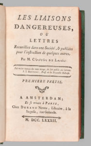 Les Liaisons dangereuses ou Lettres recueillies dans une Société, et publiées pour l’instruction de quelques autres. A Amsterdam, et se trouve à Paris, chez Durand Neveu, 1782. 4 tomes rel. en 2 vol. in-12, vélin vert, pièces de titre et tom. de maroq. rouge au dos avec petit motif doré, tr. rouges (Rel. anc.).