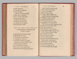 beautez qu’il voudrait en s’Amie » qui est la première oeuvre de Ronsard imprimée, ayant sa place dans toute collection ronsardienne. Au verso du ff. 103 un dixain de J. Du Bellay, non recueilli dans ses oeuvres.