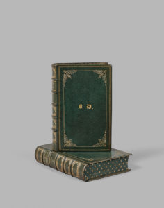 Un Prêtre marié. Paris, Achille Faure, 1865. 2 volumes in-12, maroquin vert, triple filet doré avec fleurons d’angle sur les plats, monogrammé B. D. (Barbey d’Aurevilly) au centre des premiers plats, dos à 5 nerfs orné, dent. intér., fil. sur les coupes, gardes de papier peigne, tranches bleues ornées d’un semis d’étoiles dorées (Reliure de l’époque, signée Gayler-Hirou au bas des dos).