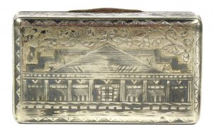 Le couvercle de la tabatière est orné d'une vue du monument à Minin et Pojarsky à Moscou. La base est ornée d'une vue de la ville ou vieille Russie. Traces de vermeil. xixème siècle. Porte les poinçons : 1) titre - 84; 2) L'essayeur H.D. (?) 1838, Moscou; 3) les initiales d'orfèvre difficiles à lire. Poids brut - 76 gr, dim.: 7,5 cm x 4,4 cm. (Usures)