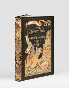 Les Aventures du chevalier Jaufre et de la belle Brunissende, traduites par Mary Lafon, illustrées de 20 belles gravures dessinées par G. Doré. P., Libr. nouvelle, 1856. Grand in-8, chagr. rouge, belle et grande composition tirée en or avec le titre et frappée sur chacun des plats, dos couvert d’ornements dor., dent. intér., doubl. et gardes de papier moiré blanc, tr. dor. (Rel. de l’éditeur).