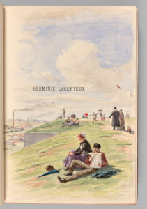 Germinie Lacerteux. Dix compositions par Jeanniot, gravées à l’eau-forte par L. Muller. P., Quantin, 1886. Gr. in-8, demimaroq. rouge, coins, dos orné en long d’un décor doré et mosaïqué, n. r., couv. cons. (Ch. Meunier).