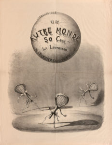 AFFICHE DE LIBRAIRIE pour Un Autre Monde. In-folio en hauteur (757x589 mm), lithographie imprimée en noir sur vélin crème par Lemercier à Paris, éditée par H. Fournier, rue Saint-Benoît, 7 (1844).