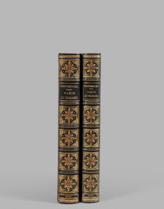 Paris au hasard. Illustrations composées et gravées sur bois par Auguste Lepère. P., imprimé pour Henri Beraldi, 1895. 2 vol. in-8 (dont un pour le texte et un pour la suite des gravures), demi-maroq. bleu, coins, dos ornés et mosaïq., tête dor., n. r., couv. et dos cons. (Champs).