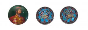Paire de boutons ronds, en argent et émaux polychromes, ornés dans le style médiéval russe. xxème siècle.