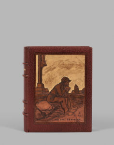 Barabbas. Paroles dans la Vallée. Dessins de Steinlen. P., Rey, 1914. In-8 carré, maroq. marron avec, incrusté sur le premier plat, un cuir incisé et doré de Steinlen, dos à 4 nerfs, large bande de maroq. intér. avec 2 fil. et motif floral doré et mosaïq., gardes de soie, tr. dor. sur témoins, couv. ill. et dos couv. et dos cons. (Lanoë).