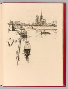 Les Bateaux de Paris. Illustrations de Eugène Béjot et Charles Huard, gravées sur bois par J. Beltrand. P., Ch. Bosse, 1903. In-4, marq. rouge, dos à 5 nerfs orné, encadr. de fil. or et mosaïqués sur les plats, encadr. de 7 fil. or gras et maigre à l’intér., couv. ill. couv. et dos cons., étui (Carayon).