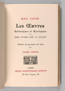 Les OEuvres burlesques et mystiques de Frère Matorel, mort au couvent. Illustreì de gravures sur bois par André Derain. Paris, Henry Kahnweiler eìditeur, 1912. In-8 (222 x 155 mm), box brun foncé, plats décorés par composition de formes courbes de maroq. brun foncé à grain long disposées verticalement et horizontalement., dos orneì, tranches doreìes sur témoins, doublure et gardes de box écorce de bouleau, couverture et dos conserveìs, eìtui (Martin, 1966).