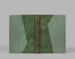 La Paix. Traduction nouvelle de L. Martin-Chauffier. Gravures au burin par J.-É. Laboureur. P., pour les Bibliophiles du Palais, 1930. Gr. in-8, maroq. et box verts se raccordant sur chaque plat suivant une ligne brisée, sur les plats, verticalement, décor stylisé au filet or, courbe, évoquant les emblèmes de la paix, par la vigne sur le plat supérieur, et le laurier sur le second plat, sur le dos titre et nom d’auteur, doubl. et gardes de papier jaune, argent et or, tête dor., n. r., couverture et dos cons., étui et chemise demi-maroq. vert (Paul Bonet, 1931).