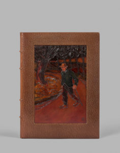Le Vagabond. P., Société des Amis des Livres, 1902. In-4, maroq. havane, cuir incisé et rehaussé de couleurs incrusté sur le premier plat, dos à 4 nerfs, fil. dor. à l’intér., doublures et gardes de toile beige, doubles gardes, tr. dor. sur témoins, couv. ill. cons. étui (Marius Michel).