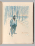 La page de garde est recouverte d’un important dessin original aux crayons bleu et rouge, avec dédicace autographe de Steinlen à M. Barthou.