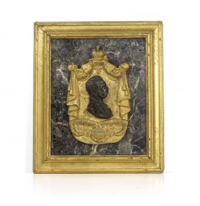 Alexandre II Profil en bronze patiné, sur fond en bronze doré, fixé sur une plaque de marbre.