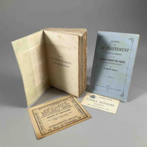 — On joint une plaquette, « Notice sur le traitement du déchaussmeent et de l’ébranlement des dents » (Paris, chez l’auteur, 1866), toute aussi rare, et se terminant en indiquant où se procurer l’élixir (chez l’auteur évidemment !).