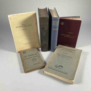 6 ouvrages autour des rayons X et Marie Curie dont Radioactivité (1935), le radium, ouvrages techniques sur les rayons X, biographie de Curie. Provenance : bibliothèque du Docteur F., Côtes-d'Armor.