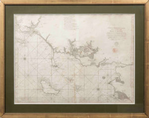 Marées". Carte extraite de l'ouvrage "Le Neptune François ou recueil des cartes marines, levées et gravées par ordre express du Roy. Premier volume contenant les côtes de l'Europe sur l'Ocean depuis Dronthem en Norvege jusqu'au détroit de Gibraltar, avec la Mer Baltique" publié en 1693. Gravure en noir, édition du dépôt de la Marine. Cachet rouge du Military Depot anglais. Fin du XVIIIe siècle. Hauteur : 61 cm. Largeur : 82 cm. (Pliure, piqûres, papier gondolé).