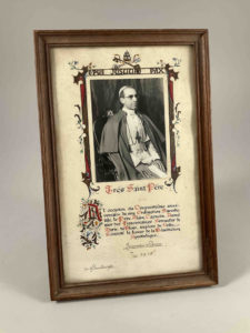 [SAINT-SIEGE - PIE XII] - PHOTOGRAPHIE de Sa Sainteté sur papier enluminé avec signature autographe de Pie XII à l'occasion de cinquantième anniversaire de l'ordination sacerdotale du Père Alain, Capucin à Blois, le 29 décembre 1952. Hauteur :...