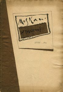 Trois (3) plaquettes in-8, (10 pp, 8 pp, 8 pp), couvertures pour «Moscau 1920» et «Moscau 1922» ornées manuellement par les découpages en papier; «Moskauer typen» - édition Trirema, Berlin, cartonnage d'éditeur titré avec des rubans noirs, 8 pp, exemplaire n°15. Accompagnées de trois (3) dessins de Iszelenof N. : 1) Scène de ville, Moscou 1920, signé, encadré, 22,8 cm x 17,8 cm. 2) Homme en costume ukrainien, 1923, monogrammé, encadré, 29,2 cm x 23,3 cm. 3) La Russie soviétique Le travailleur, 1920, 29,2 cm x 21,2 cm.