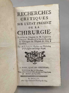 SHARP, Samuel. Recherches critiques sur l'état présent de la chirurgie. Traduites de l'anglois ... par A. F. Jault, docteur en médecine et professeur au Collège Royal. Paris, Nyon et Guillin, 1751. In-12, (6 feuillets), 370 pages.