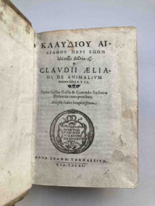 AELIANUS, Claudius. De animalium natura libri XVII | Petro Gillio Gallo & Conrado Gesnero Helvetio interpretibus | Accessit index locupletissimus (Genève), chez Jean de Tournes, 1611. In-16. (4 ff).-1018 pp. ; (47 ff) pour l'index.