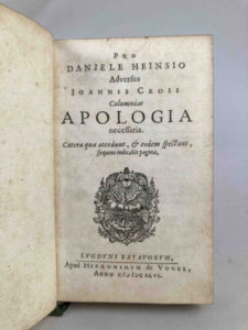 BOXHORN, Marcus Zuerius van (1612-1653). Pro Daniele Heinsio adversus Ioannis Croii | Calumnias apologia necessaria. Leiden, apud Hieron. de Vogel. 1646. In-16, (8 ff), 320 pp. numérotées 322.