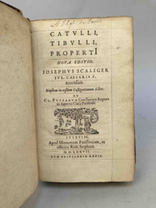 CATULLE, TIBULLE, PROPERCE . Catullus, Tibullus, Propertius. Nova editio. Josephus Scaliger recensuit. Paris, Mamert Patisson, 1577. 2 parties en 1 volume in-8, ( 8 ff), 274 pages ; 252 pages, (8ff), le dernier blanc.