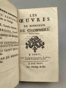 CHAMPMESLE, Charles Chevillet dit. & [LA FONTAINE]. Les œuvres de Monsieur de Champmeslé : – Première Partie : Délie, Le Parisien, Les Fragmens de Molière – Seconde partie : Je vous prends sans verd, Les Grizettes ou Crispin Chevalier, La...