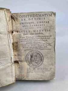 ERASMUS, Desiderius. Apophthegmatum ex optimis utriusque linguae scriptoribus libri IIX. Pauli. Manutii studio, atque industria doctissimorum theologorum consilio Venetiis, ex aedibus Manutianis. 1577. In-12, 706 pages et (22 ff).