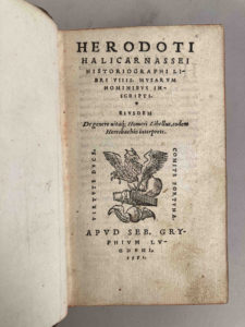 HERODOTE D'HALICARNASSE. Herodoti Halicarnassei Historiographi Libri VIIII. Musarum Nominibus Inscripti | Eiusdem De genere vitaq’ ; Homeri Libellus, eodem Heresbachio interprete. Lyon, Sébastien Gryphe, 1551. In-16, 892 pp. et (64 ff) d'index....