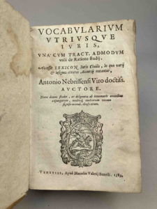 LEBRIJA, Antonio de (1441-1522). Vocabularium utriusque juris, unam cum tract. admodum utili de Ratione studii | Accessit Lexicon Juris Civilis ; Venise, Haeredes V. Bonelli. 1589. In-8, 414 ff.