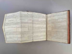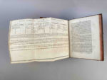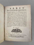 Plein veau du temps ; triple filet doré sur les plats, en cadrant le supra-librum "Réquisitoire de M. Séguier du 11 août 1786" ; dos orné d'un semis de fleurons au petit fer.