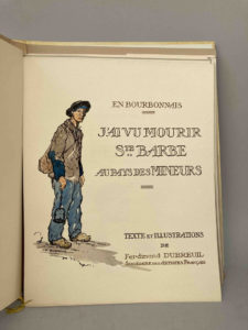 DUBREUIL, Ferdinand. En Bourbonnais. J'ai vu mourir Ste Barbe au pays des mineurs. Texte et illustrations de Ferdinand Dubreuil, sociétaire des Artistes Français. Tours, Barbot et Gallon, 1952. In-4°, 36 pages et 10 pages pour l'historique de la...