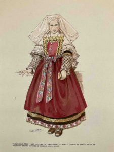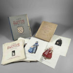 accidentée). - Victor LHUER, Le costume breton de 1900 jusqu'à nos jours, Au Moulin de Pen-Mur, Paris, 1943. In 4 en feuilles sous chemise éditeur imprimée à lacets (accidents). 16 pages de texte, une carte en couleurs, 95 planches de costumes en couleurs sur 99. (Rousseurs, piqûres, manque les deux feuillets de table).