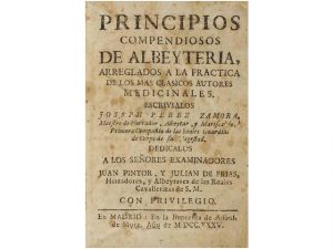 1735. (EQUITACION). PEREZ ZAMORA, JOSEPH: PRINCIPIOS COMPENDIOSOS DE ALBEYTERIA, ARREGLADOS A LA PRACTICA DE LOS CLASICOS AUTORES. Madrid: En la Imprenta de Alfonso de Mora, 1735. 8°. 12 h. + 230 p. Enc. en pergamino de època. Palau 222755...