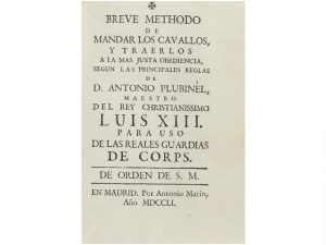 1751. (EQUITACION). PLUBINEL, ANTONIO: BREVE METHODO DE MANDAR CAVALLOS, Y TRAERLOS A LA MAS JUSTA OBEDIENCIA SEGUN LAS PRINCIPALES REGLAS DE... Madrid: Antonio Marin, 1751. 8° menor. 3 h. + 66 p. Ilutr. con 8 de las 11 lams. plegadas grabadas al...
