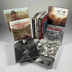 Grande Guerre en cartes postales ; La Première Guerre Mondiale, collection photographique de Jean-Pierre Verney ; Isabelle DUMIELLE, 1914-1918 des soldats, des hommes ; Jean LOPEZ, 14-18 En première ligne ; Jean-Pierre VERNEY et Jérôme PECNARD, La Guerre de 1914-1918 en relief ; Coll. 1916 année de Verdun ; David SHERMER, La Grande Guerre 1914-1918 ; Susanne EVERETT, La Première Guerre Mondiale ; Jean-Pierre VERNEY, La Première Guerre 1914-1918, reproductions d'affiches et de journaux d'époque et album photo ; La Première Guerre Mondiale 1914-1918, collection Reportages de Guerre. (En l'état).