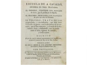1751 ca. (EQUITACION). RODRIGUEZ JORDAN, SALVADOR: ESCUELA DE A CAVALLO, dividida en tres tratados. El primero, contiene los manejos de tierra, que se practican en Espana. El segundo, demuestra los manejos de ayre, que usan las Naciones. El tercero,...