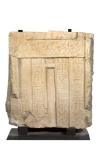 Stèle fausse porte à double dénivellation et à tore cylindrique gravée sur le linteau d’une scène représentant un dignitaire assis devant deux lignes et une colonne d’inscription en caractères hiéroglyphiques. Les doubles montants sont également gravés de textes en caractères hiéroglyphiques et sont ornés en bas de représentations du propriétaire debout tenant une longue canne. Dépôt calcaire et coloration grise en profondeur.