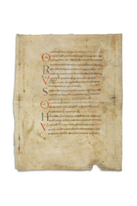 Grand feuillet manuscrit sur parchemin (360 x 290 mm), écrit en latin, recto et verso sur 20 longues lignes par page, initiales rouges et noires alternées, rubriques en écriture onciale et texte en minuscule caroline. Réemploi de reliure. Remarquable manuscrit liturgique de la période carolingienne datable de la seconde moitié du IXe siècle.