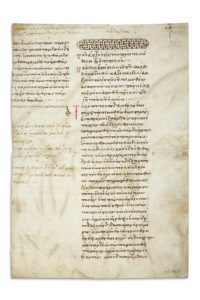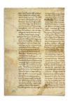 Un feuillet sur parchemin, 299 x 215 mm (299 x 215 mm) ; 35 lignes sur deux colonnes ; encre carbone ; réglures à la pointe sèche, foliotation grecque « ΙΘ/I » (19/1), « 113 » (ancienne cote ?) ; minuscule grecque cursive légèrement italique, quelques ligatures calligraphiées ; initiales rubriquées, bandeau à l’encre noire avec un travail d’entrelacs, frise à l’encre rouge et noire orné en fin d’un motif trifolié à la fin du recto du feuillet, guillemets rubriqués marginaux au verso du feuillet ; le feuillet porte les marques d’un ancien réemploi de reliure, marge intérieure rognée avec léger manque de texte (2 ou 3 lettres manquantes). Fragment d’un manuscrit grec daté du 11e/12e siècle du plus célèbre commentaire biblique du début de la chrétienté provenant de la bibliothèque d’un des fondateurs de la Renaissance florentine, Niccolò Niccoli.