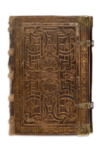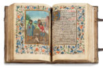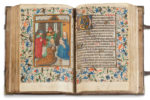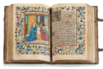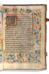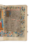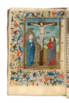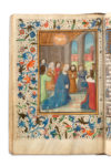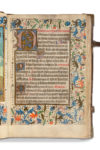 carbone ; réglures à l’encre jaune pâle ; textualis formata ; 14 miniatures pleine page, 22 vignettes enluminés (Péricopes, Obsecro te, O intemerata et suffrages), initiales champies peintes dorées à la feuille avec entrelacs de fleurs trilobées en leur centre (sur six lignes), initiales champies dorées à la feuille (sur deux lignes) parfois avec antennes filigranées et fleuries, initiales dorées ou filigranées dans le texte, encadrements sur fonds criblé doré avec feuilles d’acanthe bleues et oranges et petite végétation simple aux couleurs vives, bouts de lignes à l’encre rouge et bleue avec un écu doré au milieu (litanies), rubriques. Plein veau à entrelacs Renaissance avec reste de cires colorées (XVIe s.), dos à 5 nerfs avec caissons ornés à double filets d’encadrement, plats à riche décors d’entrelacs et encadrements de filets et roulette, reste de cire colorée blanche, bleue et rouge, coins renforcés par des pièces de laiton d’époque et fermoirs partiellement d’époque (attache XIXe), roulette sur le coupes, tranches dorées ; restaurations au dos (coiffes et nerfs) qui faiblissent au mors du plat supérieur, Superbe livre d’heures à l’usage d’Utrecht produit dans les ateliers flamands au troisième quart du XVe siècle.