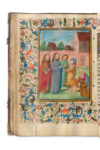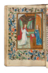 ICONOGRAPHIE Les enluminures ont probablement été réalisées par un artiste néerlandais actif à Bruges vers 1470. Liste des miniatures à pleine page : − f.10v : Crucifixion avec la Vierge et saint Jean; à l’arrière-plan un paysage de bosquets. − f.14v : Pentecôte dans le Cénacle. La Vierge est entourée des apôtres dans un édifice aux arcades ouverte laissant apercevoir l’enceinte d’un domaine. − f.17v : Nativité et adoration des anges. La Vierge tient l’enfant Jésus devant deux anges agenouillés, dans un édifice gothique à colonnes et aux fenêtres en ogive. − f.31v : Annonciation. La chambre de la Vierge est de teintes orange et vert ; Gabriel porte une longue cape rouge. − f.41v : Visitation. La Vierge et Elisabeth se rencontrent sur le seuil d’une chaumière devant une imposante bâtisse lacustre à toit pointu et chienassis, flanquée d’une tour médiévale à toiture bleue, avec pont-levis à l’arrière. Une entrée par l’eau est visible derrière la Vierge. − f.47v : Nativité. L’enfant jésus dans son ovale d’or est encadré par Marie, Joseph et l’ange au second plan, ses ailes déployées, dans une sorte de seuil entre intérieur et extérieur d’un bâtiment aux fenêtres à croisées.