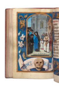 − f.199r : Office funèbre (Office des morts) Il est probable que le manuscrit possédait initialement une miniature de la Crucifixion (pour les heures de la Croix) et peut-être également pour introduire les heures de la Vierge (ou même tout le cycle). Les principaux livres devaient être chacun introduits par une miniature et une page de texte ornée d’une vignette historiée avec un large encadrement peint